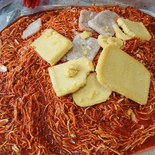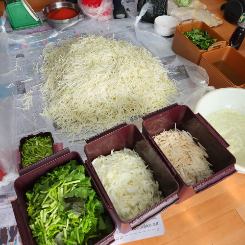 무, 배, 양파를 넣고 비벼서 준비해서 디포리 육수 3kg, 멸치육수 3kg를 넣어서 같이 버물려 주시면 됩니다.