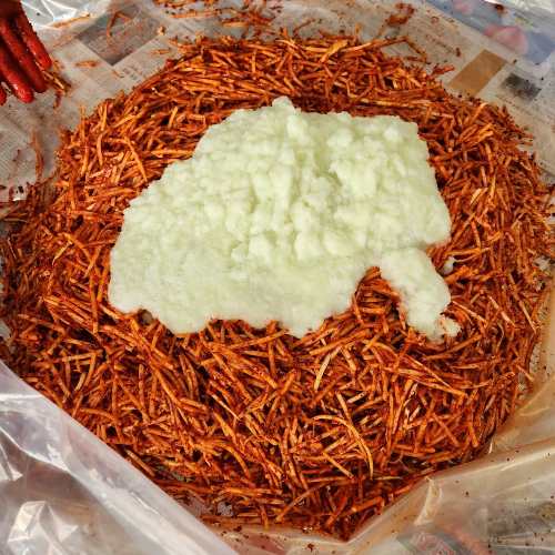 3. 고춧가루 3.1kg를 채 썬 무와 비벼서 물들어 주시면 됩니다.