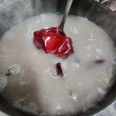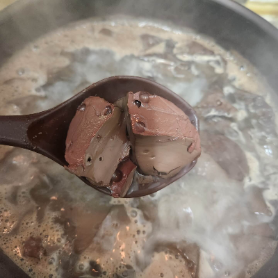 위 사진처럼 커다란 솥에서 물이 끓기 시작하면 선지를 국자나 컵, 그릇으로 퍼서 끓여주시면 됩니다. 선지는 사진처럼 빨갛고, 윤기가 나는 것이 신선한 선지입니다.