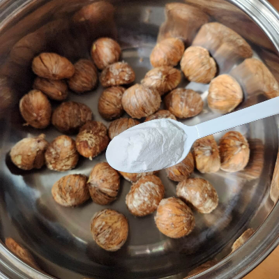 3. 밤껍질에는 떫은맛이 많이 나기 때문에 하루정도 "베이킹소다 한숟가락"를 활용해서 12시간 ~ 24시간 정도 물에 담궈주시면 됩니다. 물 양은 밤이 잠길 정도만 물을 넣어주시면 됩니다. 많이 넣어도 상관없습니다.