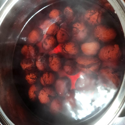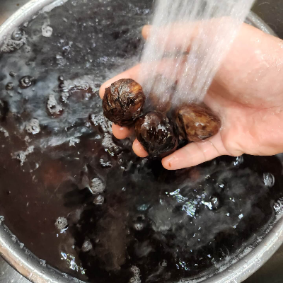 10분이 지나면 물로 헹구고, 20분이 지나면 또 헹구고, 10분이 지나면 또 헹궈주는 것을 3번 해주었더니 삶은 밤 색이 이쁜 붉은색이 됐습니다.