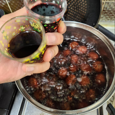 10. 뚜껑 덮고 센 불로 30분 끓여주시고 소주잔에 있는 진간장, 와인 넣고 10분간 추가적으로 졸여주시면 완성입니다.