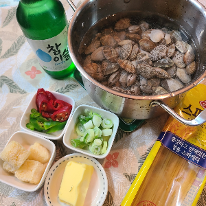 - 바지락 술찝 재료: 바지락, 통마늘 또는 다진 마늘 6~10알 (취향 것 추가 가능), 페페론치노 (11개), 대파 조금, 고추 조금, 버터 큰 한 숟가락(많아도 맛있어요.), 물 1컵 반, 소주 한 컵