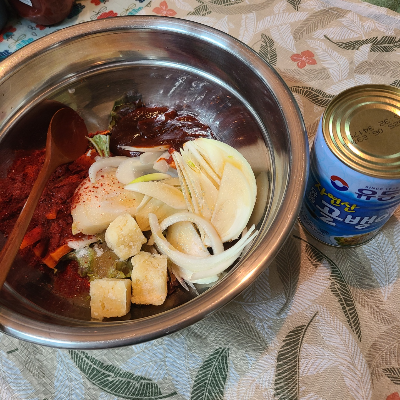 1. 골뱅이 무침은 정말 간단해요. 각종 채소들을 다 넣고 양념장에 버무리는 게 끝이에요. 개인적으로 여기서 양념장이 퍽퍽할 수 있지만 저는 유동 골뱅이 안에 있는 국물을 1숟가락 ~ 2숟가락 넣어주는 편인데 풍미랑 맛이 배가 되는 효과를 느낄 수 있을 거예요. 정말 맛있거든요.