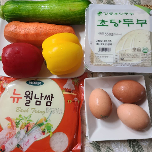 - 애호박, 당근, 파프리카 2개, 달걀 3개, 라이스페이퍼, 두부, 양배추
