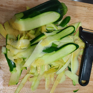 4. 애호박은 감자깎이 칼로 얇게 썰어주시소 소금 티스푼으로 1숟가락 넣어서 살짝 절여줍니다. 얇게 썰면 식감은 줄겠지만 라이스페이퍼 안에서 안 찢어지고 맛있게 드실 수 있습니다. (소금 안하셔도 됩니다.)