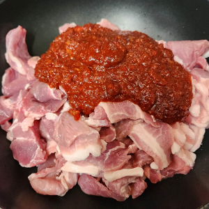 2. 여기서 가장 중요한 것은 양념장이라 돼지고기는 당연히 잘 섞어줘야 됩니다.
