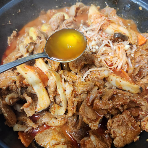 4. 마지막에 들기름을 한 숟가락 넣는 이유는 구수한 맛과 다시 한번 돼지고기의 잡내를 잡아주는 역할을 해주고 물엿은 제육볶음의 윤기와 단맛을 추가하는 용도입니다.