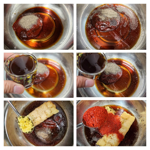 - 양념장: 숟가락 기준 간장 6, 고추장 3 후추 반 숟가락, 매실액 소주잔 1잔(50ml), 고춧가루 4, 맛술 1, 생강 다진 것 (1숟가락), 마늘 94g (한주먹, 종이컵 2/3), 물엿 1, 들기름 1