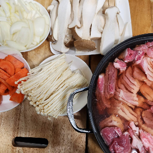 - 재료: 돼지고기(제육볶음용), 새송이버섯 4개, 당근 반개, 팽이버섯 1개, 생갈 10g(한쪽), 양파 반개, 남은 맥주, 고구마나 청양고추 취향 것 준비해주세요.