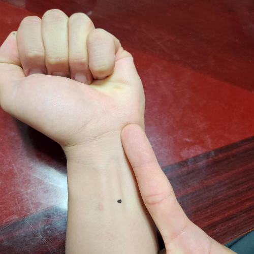 b. 내관혈의 위치는 사진과 보이는 위치인데요. 손목 부분에서 손가락이 2마디 ~3마디 사이 위치입니다. 동그라미 점을 찍었죠? 그 부분을 지압이나 침을 맞으면 좋습니다. 집에서는 지압을 해주시면 좋을 거 같아요.