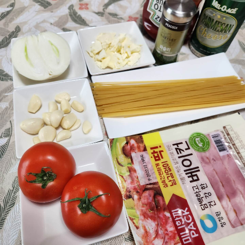 1, 토마토 2개 (300g), 베이컨 1개 (80g), 양반 반개 (146g), 버터 큰 2숟가락(29g) , 통마늘 14개 (45g), 케첩, 파슬리, 파마산 치즈가루(없으면 후추 대체), 파슬리가루, 소금, 올리브유, 스파게티면 1인분 기준 100g 준비해주세요.