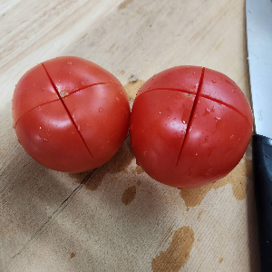 2. 토마토 뒷부분을 십자가로 칼집을 내주고 끓는 물에 2분 30초 ~ 3분을 삶아요.