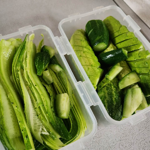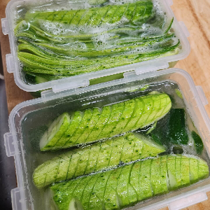 3. 슬라이드 친 오이, 아코디언으로 썰은 오이는 각각 통에 담아주시면 1차적으로 완성이 됩니다.