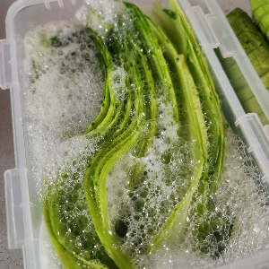 1. 처음은 포크로 짙은 초록색 부분에 포크를 찔러서 감자깎이로 내려 주시면 됩니다. 얇게 슬라이드를 치게 되면 더 빨리 숙성되지만 아삭아삭한 식감으로 더 맛있게 드실 수 있으세요.