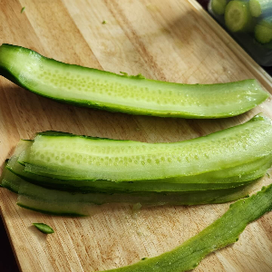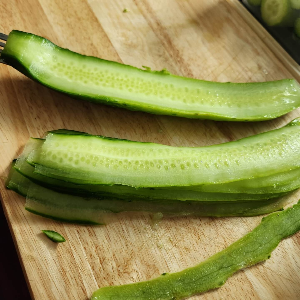 이제 남은 오이를 감자깎이를 이용해서 슬라이드 칠 거예요.