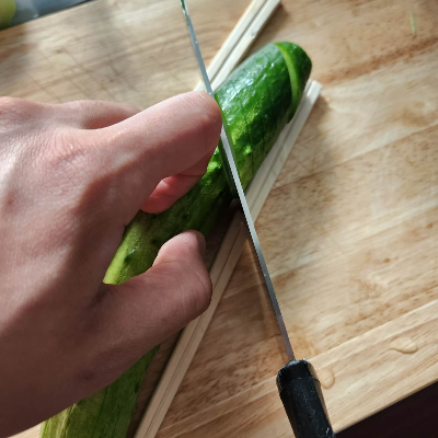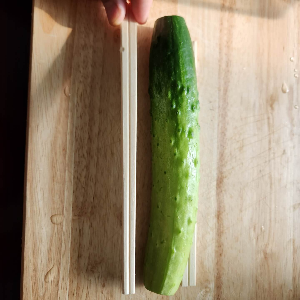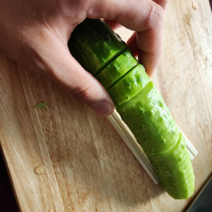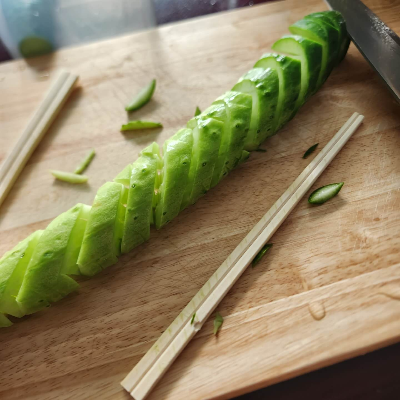 2. 그리고 나무젓가락을 오이 사이에 두고 " / " 방향으로 썰고, 다시 반대 편도 "\" 방향으로 썰어주시면 됩니다. 그러면 "#"모양으로 끊기지 않고 늘어납니다.