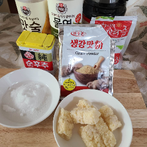 - 맛술 100ml, 남은 술 100ml, 간장 200ml, 생강가루 반수저, 사과즙 1개 또는 사과즙 또는 사과 주스 반캔, 물엿 반 숟가락, 후추 반 숟가락