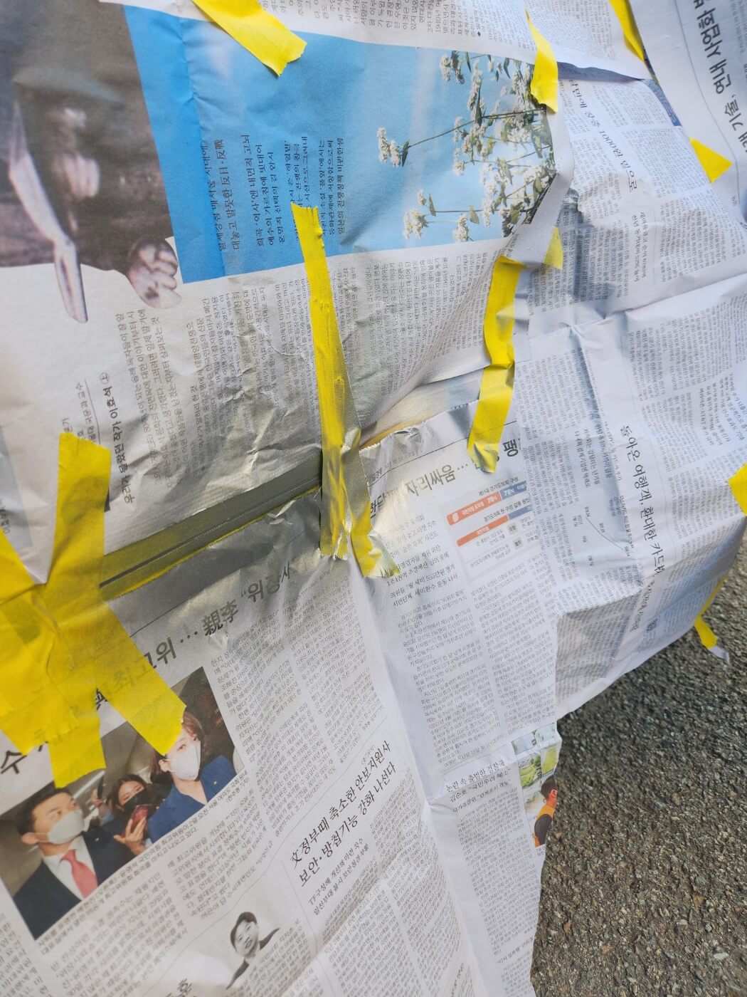 노란색 테이프로 해당 부위를 감싸주고 다시 한번 주변을 또 감싸줍니다. 저는 노란 테이프로 해당 부위를 위, 아래, 옆면을 모두 테이핑을 하고 주변은 신문지로 하나하나 덮어주면서 했습니다.