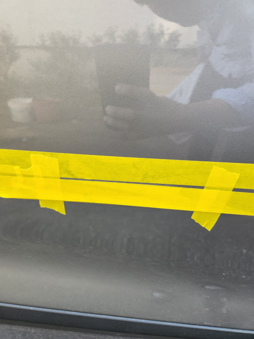 4. 노란색 테이프 자국과 스크래치 주변 덕지덕지 스프레이가 닿아서 노란색 테이프를 제거한 남은 자리에 끈끈이가 남아 있습니다. 이 부분은 물파스로 손쉽게 지울 수 있는지만 저는 타르 제거제를 이용해서 지워줬습니다.