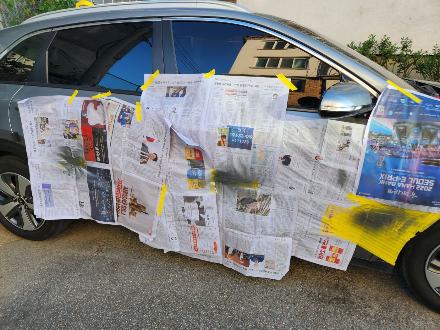 1. 차량에 스프레이를 뿌리기 위해서 스크래치 부위 제외하고 전부 테이프랑 신문지로 스프레이 분사했을 때 다른 곳에 안 묻게 덕지덕지 가려줍니다!