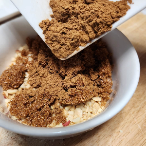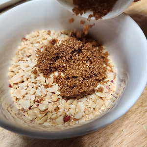 2. 그릇에 땅콤, 흑설탕 2/3컵 80g, 계핏가루 1숟가락 5g을 넣고 잘 섞어주시면 돼요.