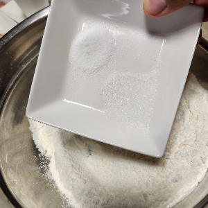 3. 반죽통(?), 큰 그릇에 강력분 170g, 찹쌀가루 50g, 설탕, 소금 1 티스푼을 넣고 숟가락으로 잘 섞어주세요.