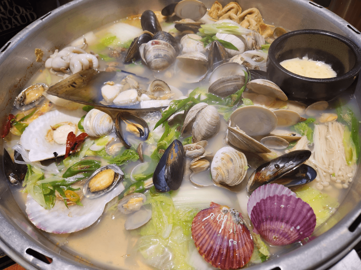 12분이 지나면 타이머가 울리기 시작하는데요. 직원분이 키조개를 가장 먼저 손질해 주십니다 키조개 자체가 많이 익으면 질겨져서 가장 먼저 먹는 게 좋습니다. (개인적인 취향이니 참고 부탁드립니다.) 키조개를 드시고 나면 "가리비"를 드시는 걸 추천드립니다. 가리비도 키조개와 마찬가지고 너무 익게 되면 질겨져서 특유의 식감과 부드러움이 없어집니다. 그리고 이제 취향 것 드시면 되는데 전복 같은 경우는 전복 이를 잘 제거해서 드시면 좋습니다. ( 전복 이빨이 어딘지 모르시면 더듬이 두 개 인 부분을 가위로 잘라서 드시는 게 좋습니다.) 저는 개인적으로 초장보다는 간장에 고추냉이를 풀어서 먹는 것을 좋아하는데 정말 맛있게 먹었던 것 같습니다. 어묵은 바로 드셔도 되지만 저는 쫄깃한 어묵보다는 부드러운 어묵을 더 선호해서 어묵을 마지막에 먹었던 것 같습니다. 이제 시간이 어느 정도 지나면 그냥 다 퍼먹으면 되는데 이게 너무 좋았던 것 같습니다. 국물도 시원 칼칼하고 계란찜도 고소하니 맛있었습니다.