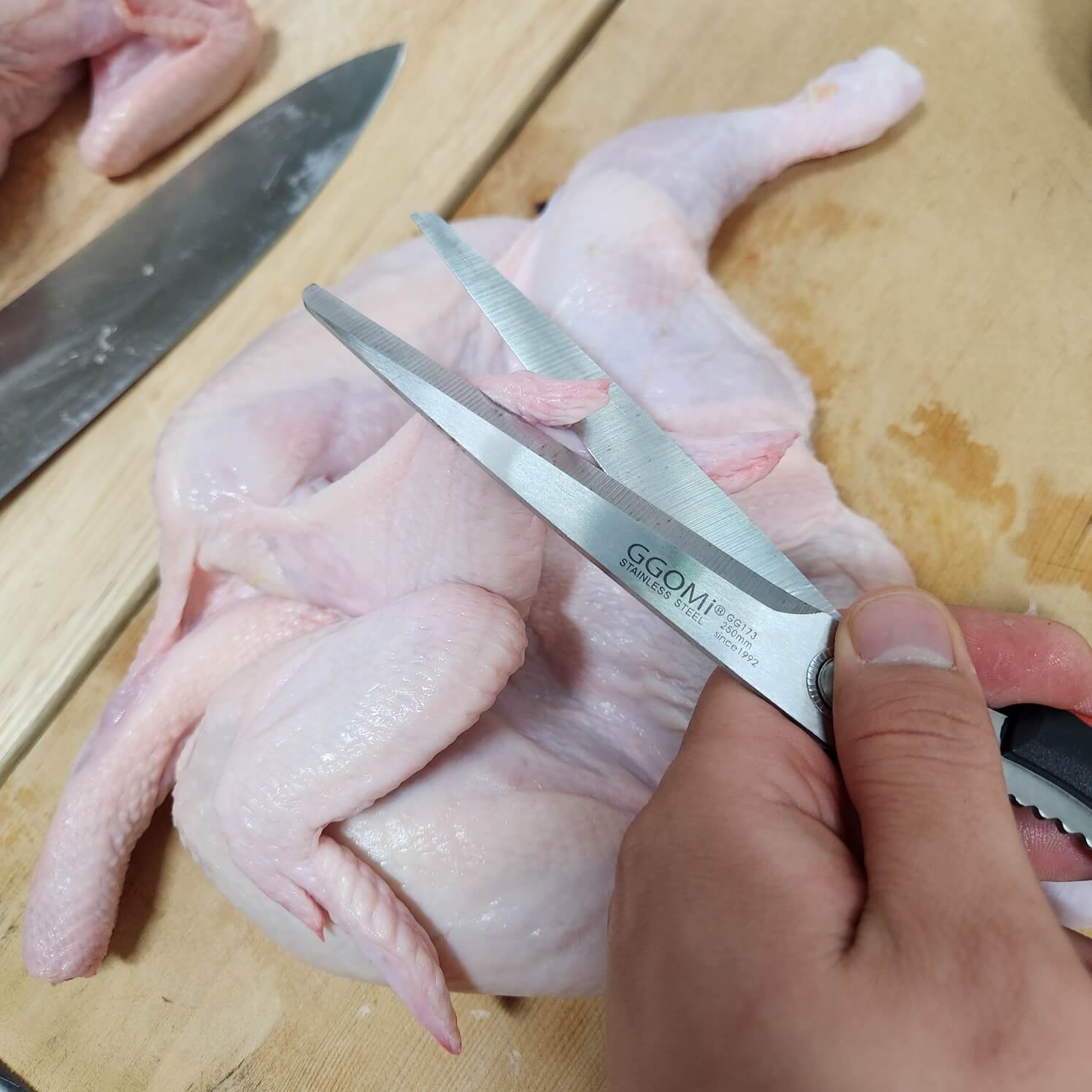 1. 닭고기는 닭의 꽁지를 칼로 잘라주고, 날개의 뼈 부분의 작은 날개 뼈를 가위로 잘라주세요.