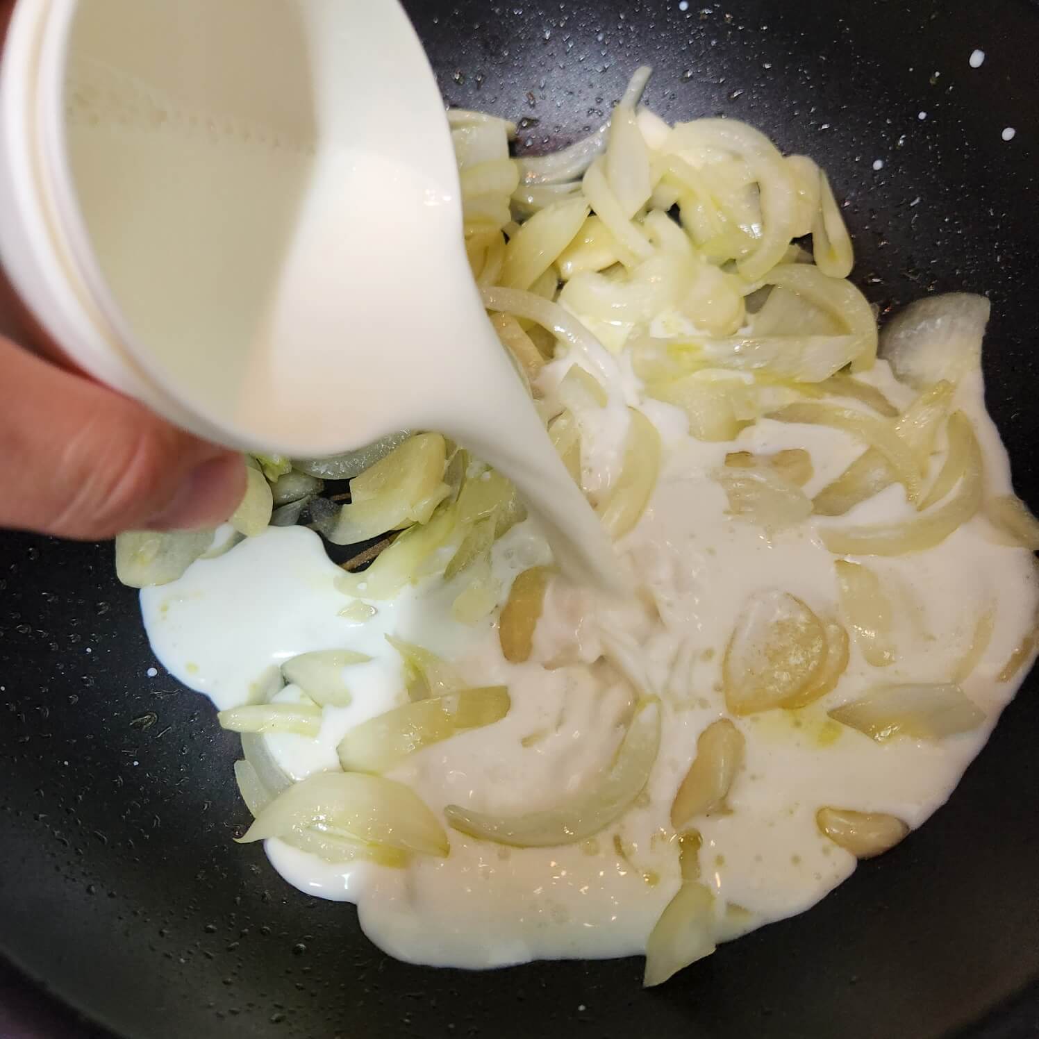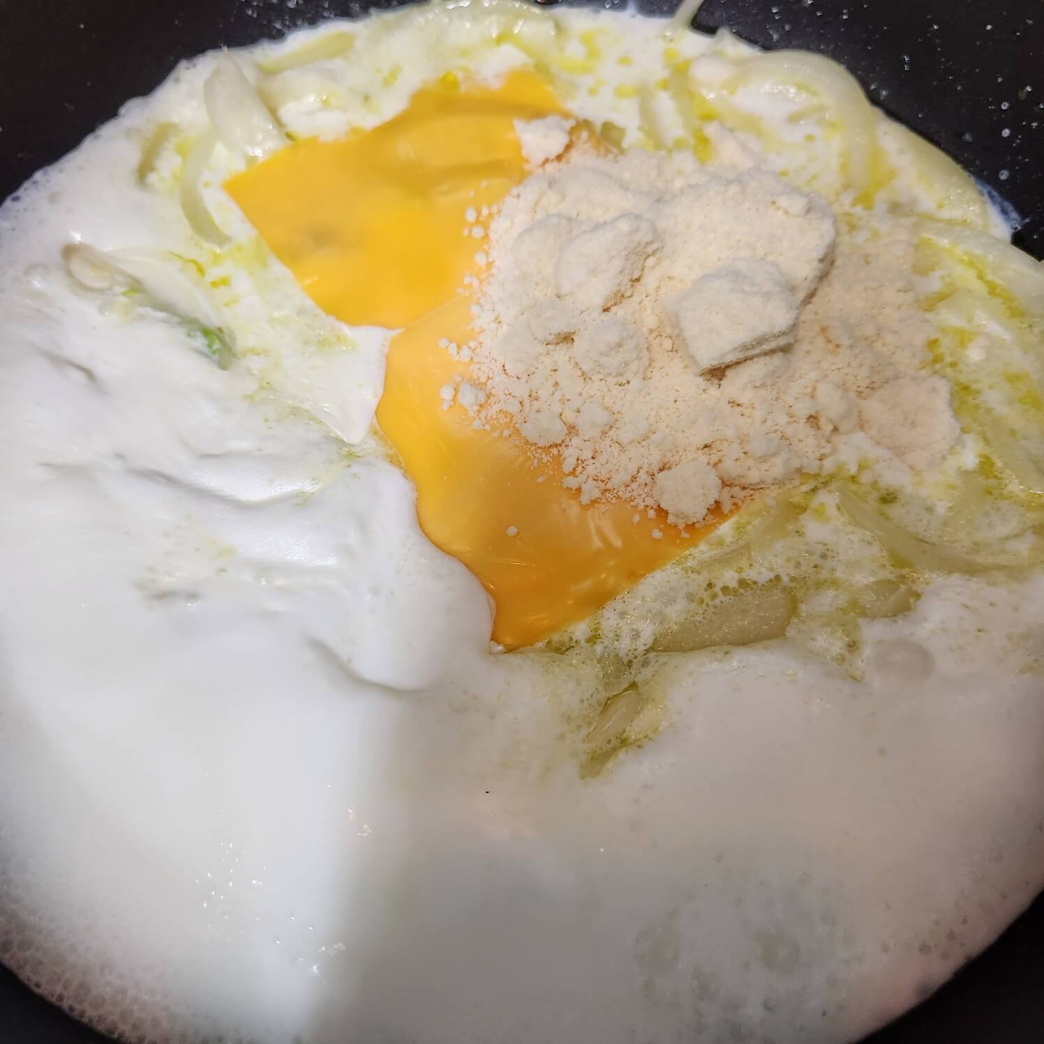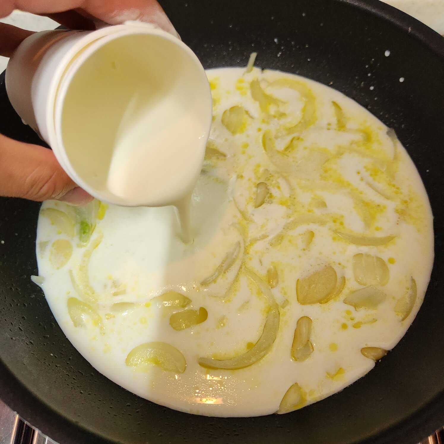 2. 종이컵 기준 가득 우유 2컵, 생크림 1컵, 파마산치즈가루 4/5컵, 체자치즈 2장을 넣고 센 불로 끓여주세요.