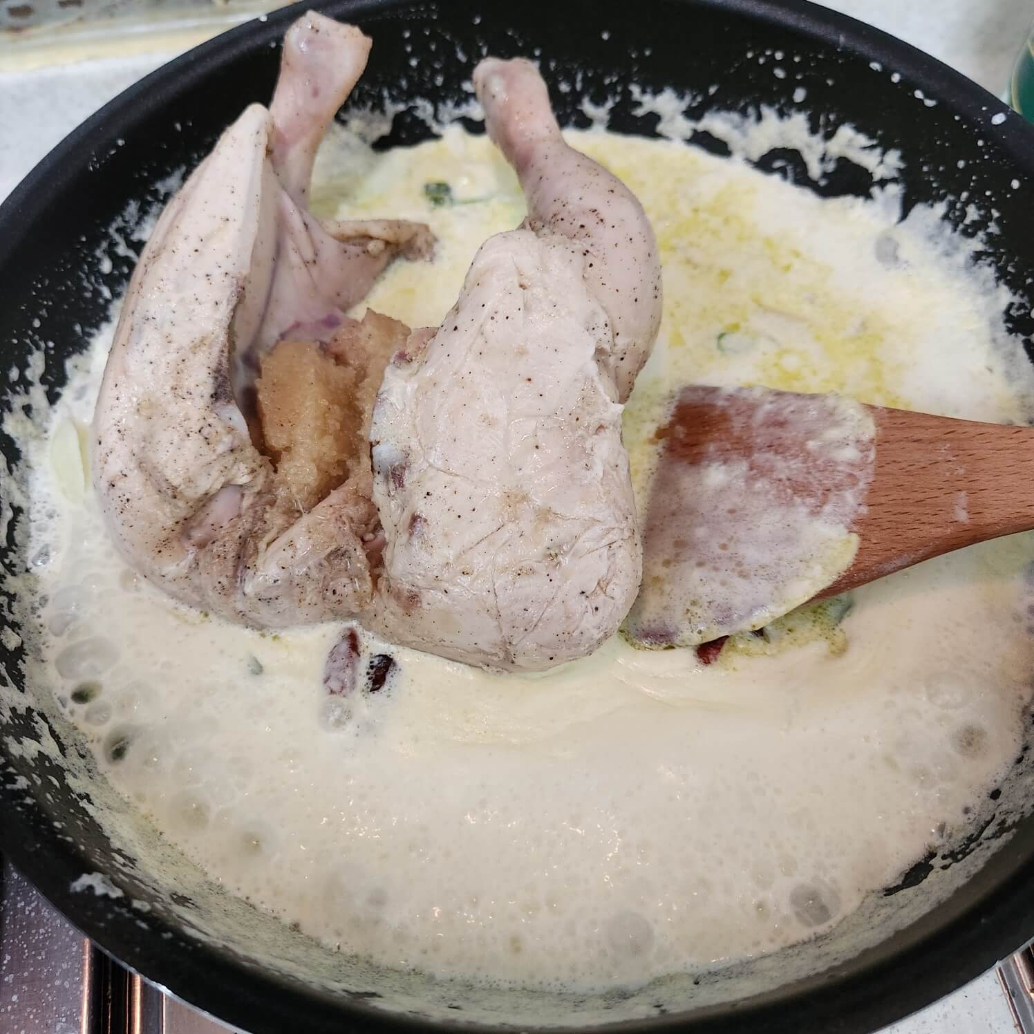 6. 크림소스가 타지 않게 저어가면서 중간불로 수비드 치킨을 마무리로 익혀주세요.