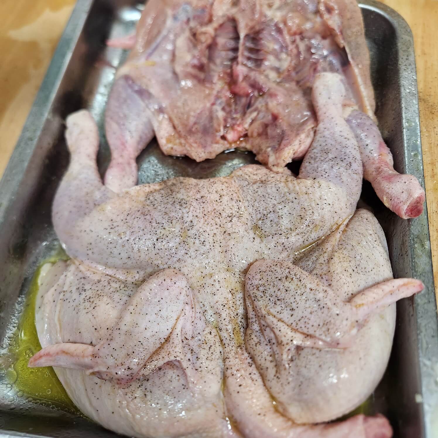 5. 생닭은 올리브유를 바르고 소금, 후추를 뿌려서 두드려주시면 완성이에요.