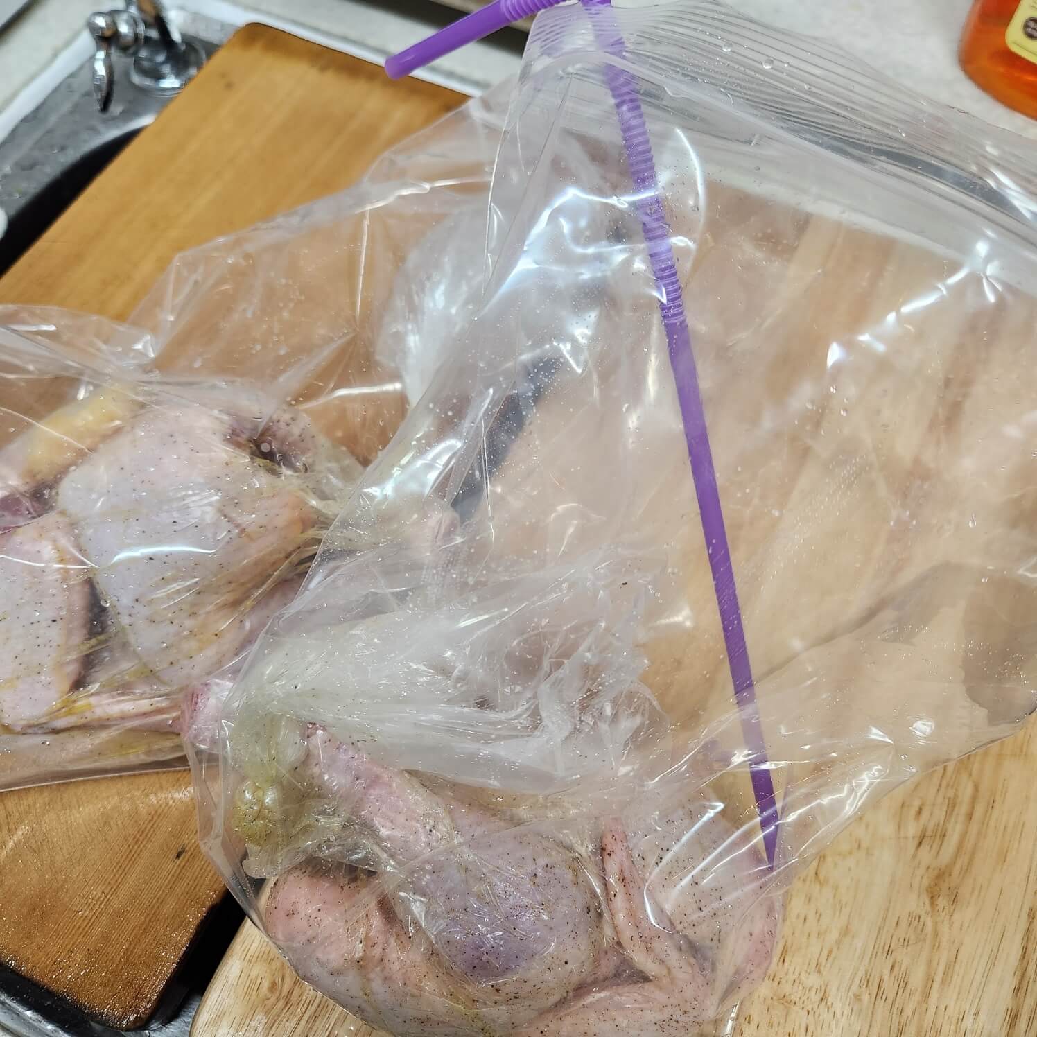 6. 수비드 전용 비닐이 떨어져서 일반 비닐봉지로 닭을 넣고 공기를 빼줬어요.