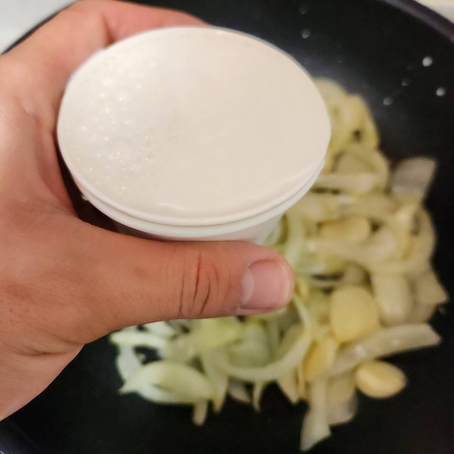 👉중간불로 양파 1개, 마늘 8개 편 썰은 것을 넣고 색깔이 갈색으로 변할 때까지 볶아주세요.