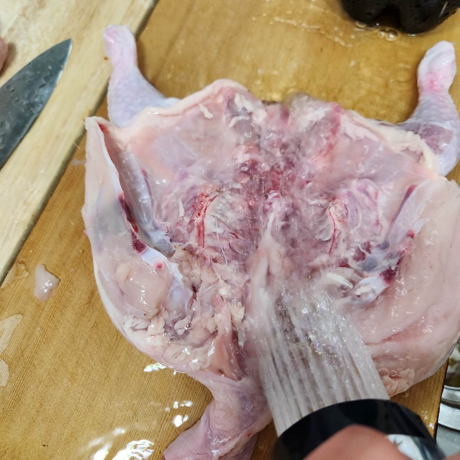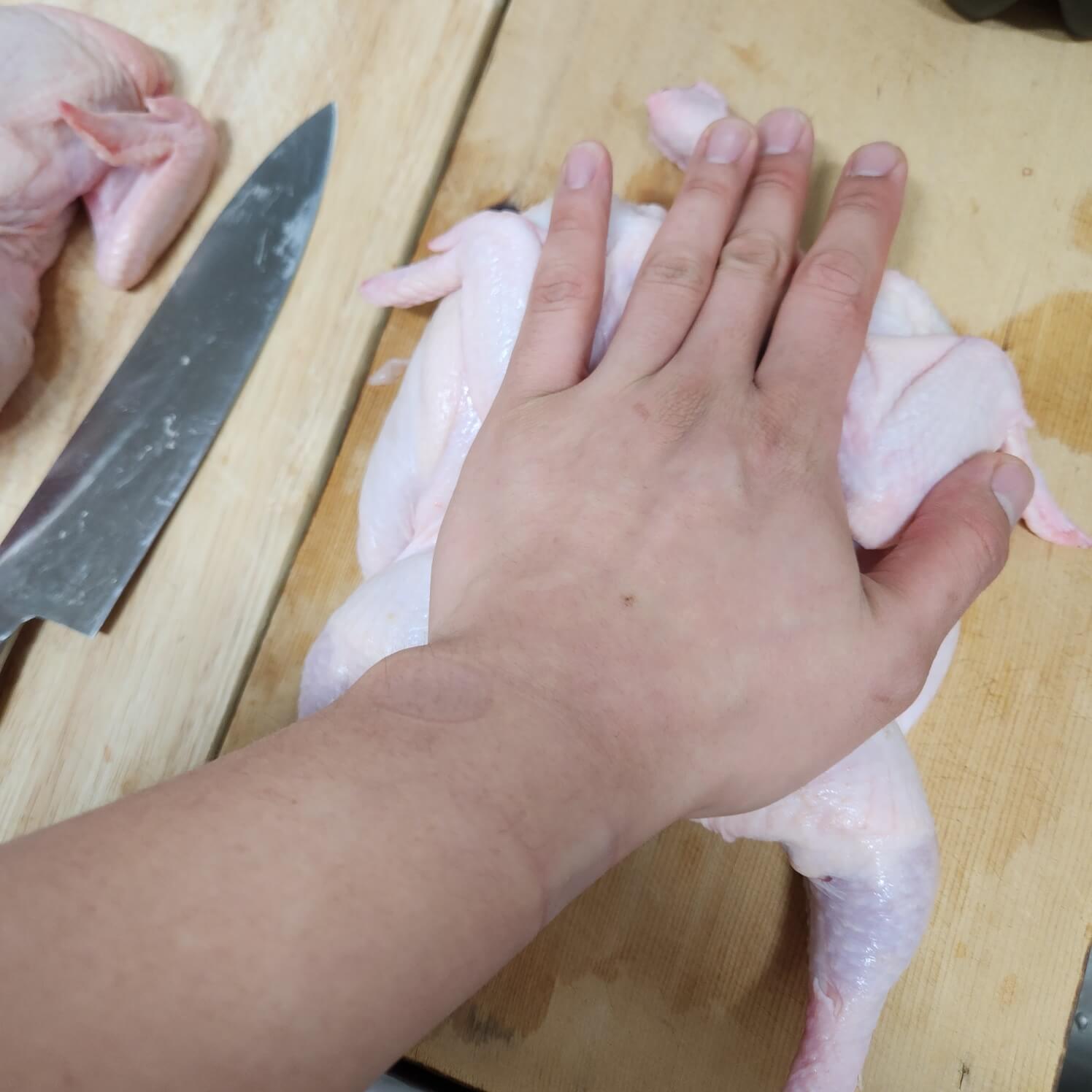 3. 닭 뼈 찾기 어려우시면 닭은 손바닥으로 눌러주세요. 그럼 닭뼈가 "우두득" 소리 나면 퍼 펴질 거예요.