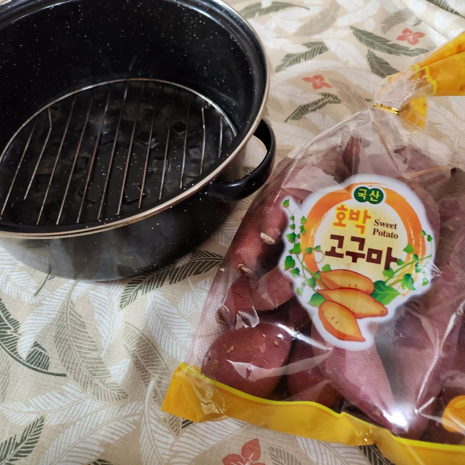 직화 냄비로 군고구마 굽기