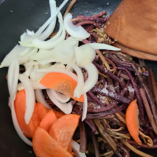 3️⃣고사리가 살짝 갈색 빛깔을 띄기 시작하면 손질했던 양파와 당근을 넣고 볶으면서 설탕 0.5 숟가락 넣어주면 완성이 된다.