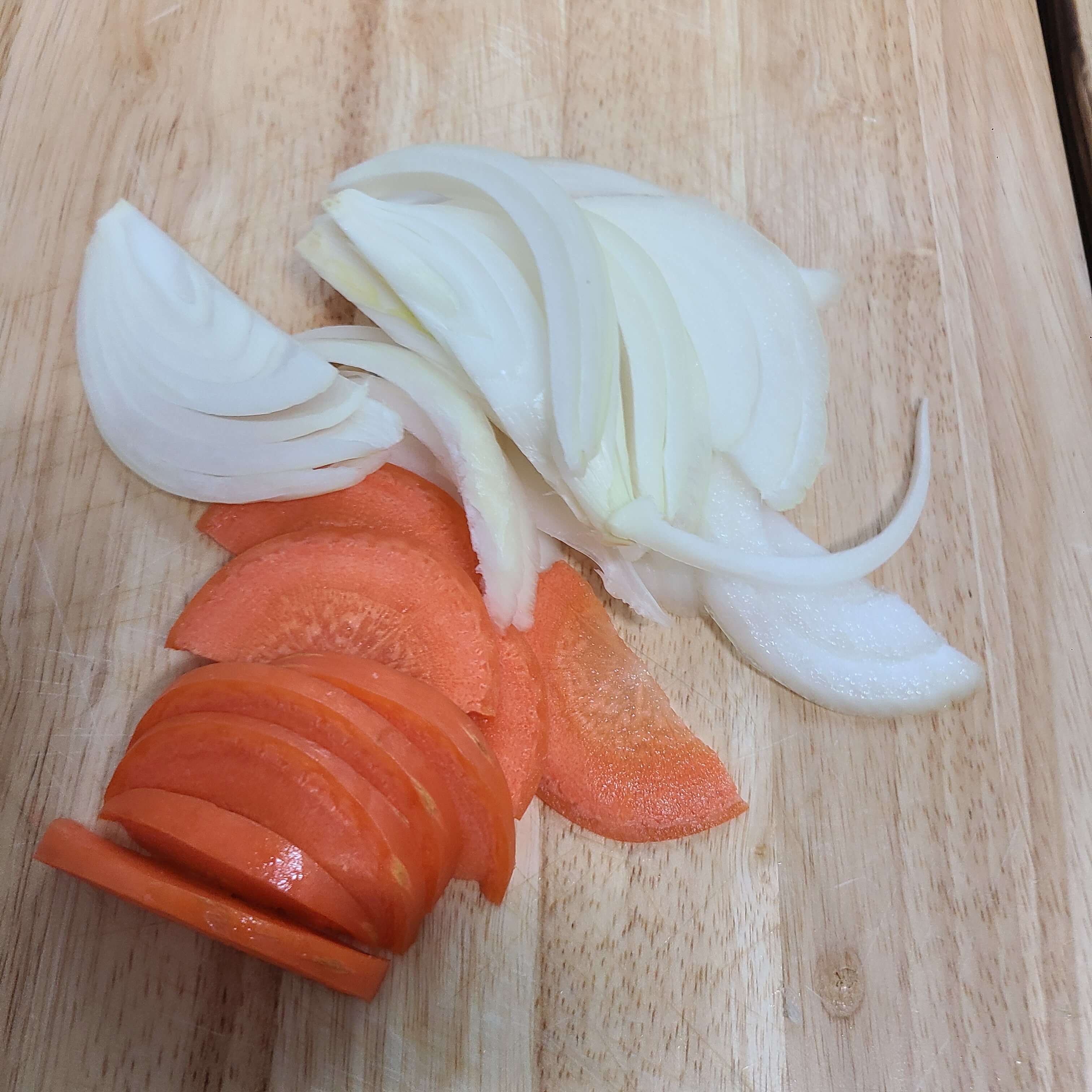 - 양파 채썰기, 당근은 반달 썰기로 준비해주면 된다.