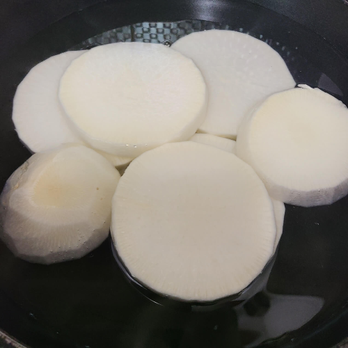 1. 먼저 무를 두툼하게 자르고 나서 냄비에 넣어 줍니다.