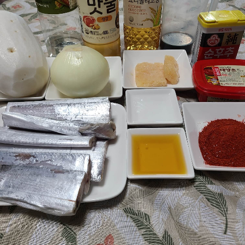 • 갈치 2마리, 작은 무 1개, 물 1리터, 양파 1개, 소주, 고춧가루, 맛술, 물엿, 청양고추 2개 (취향껏), 고추장, 후추, 들기름, 올리고당, 간장