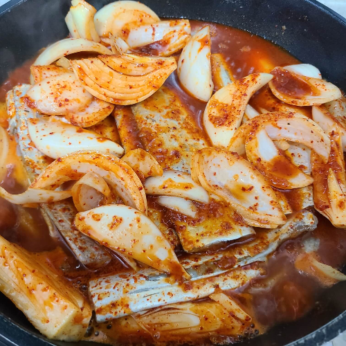 • 무 760g, 갈치 542g, 양파 280g, 숟가락 기준 소주 6, 고춧가루 3, 맛술 1, 물엿 1, 올리고당 1, 고추장 2,, 들기름 3, 간장 8.5 (60ml)
