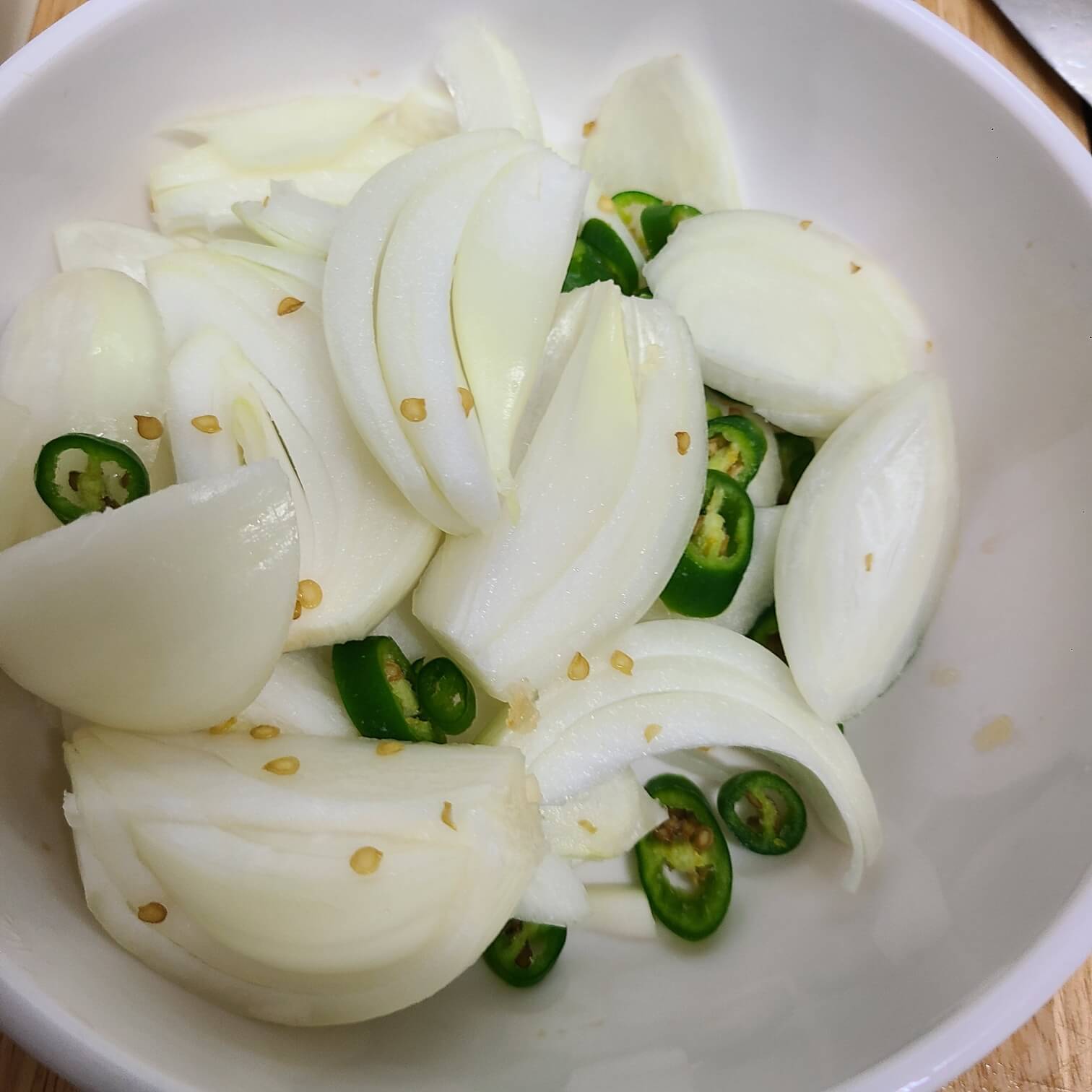 2. 양파는 두껍게 채 썰고, 청양고추 2개는 "쏭쏭" 썰기로 담아주면 된다.