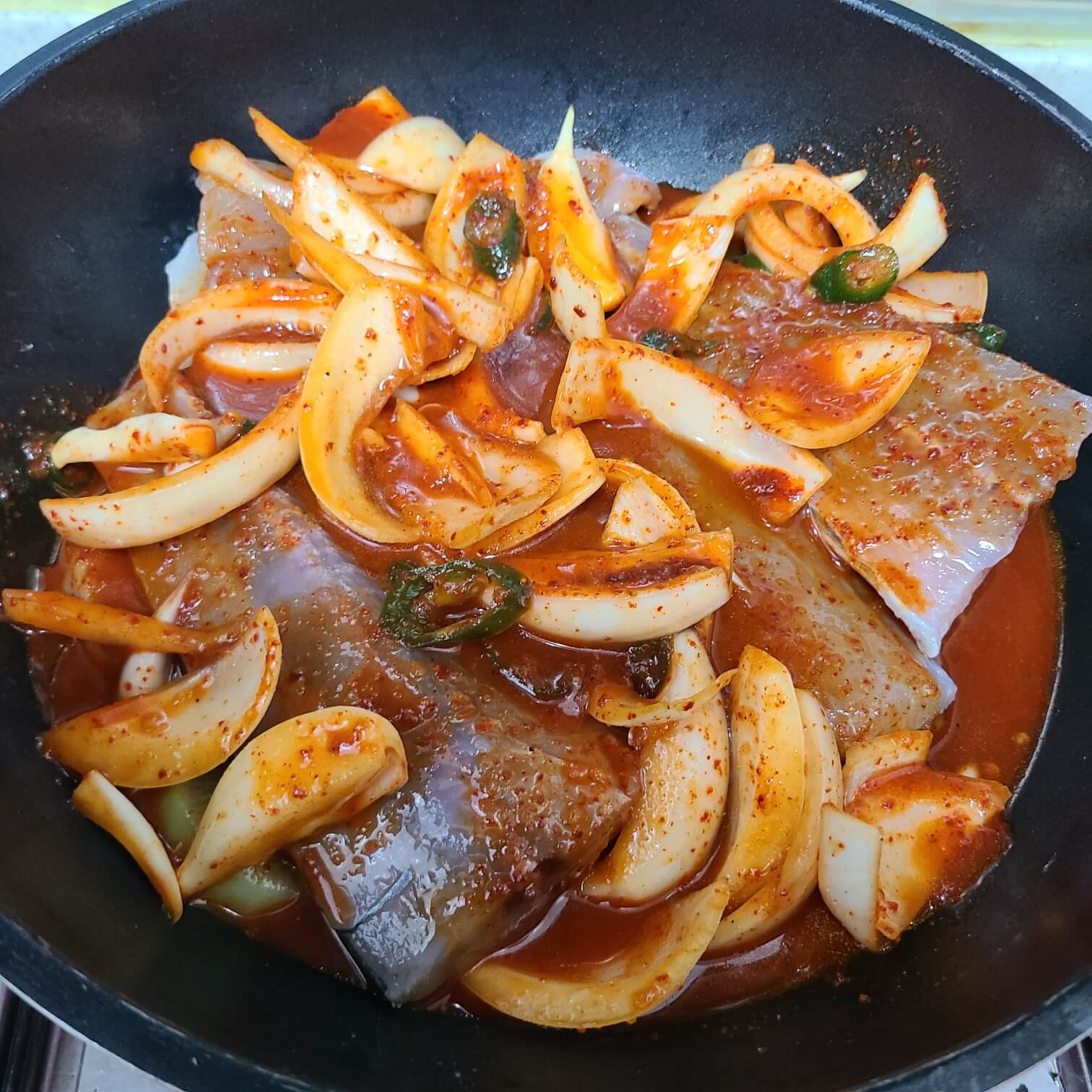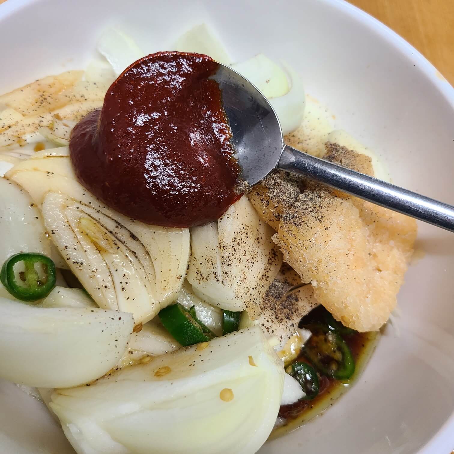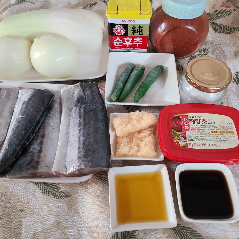 • 삼치 1마리, 작은 무 1개, 양파 1개, 청양고추 3개 (취향 것), 다진 마늘,  고춧가루, 고추장, 맛술, 들기름, 소주, 후추, 설 탈, 물엿, 간장