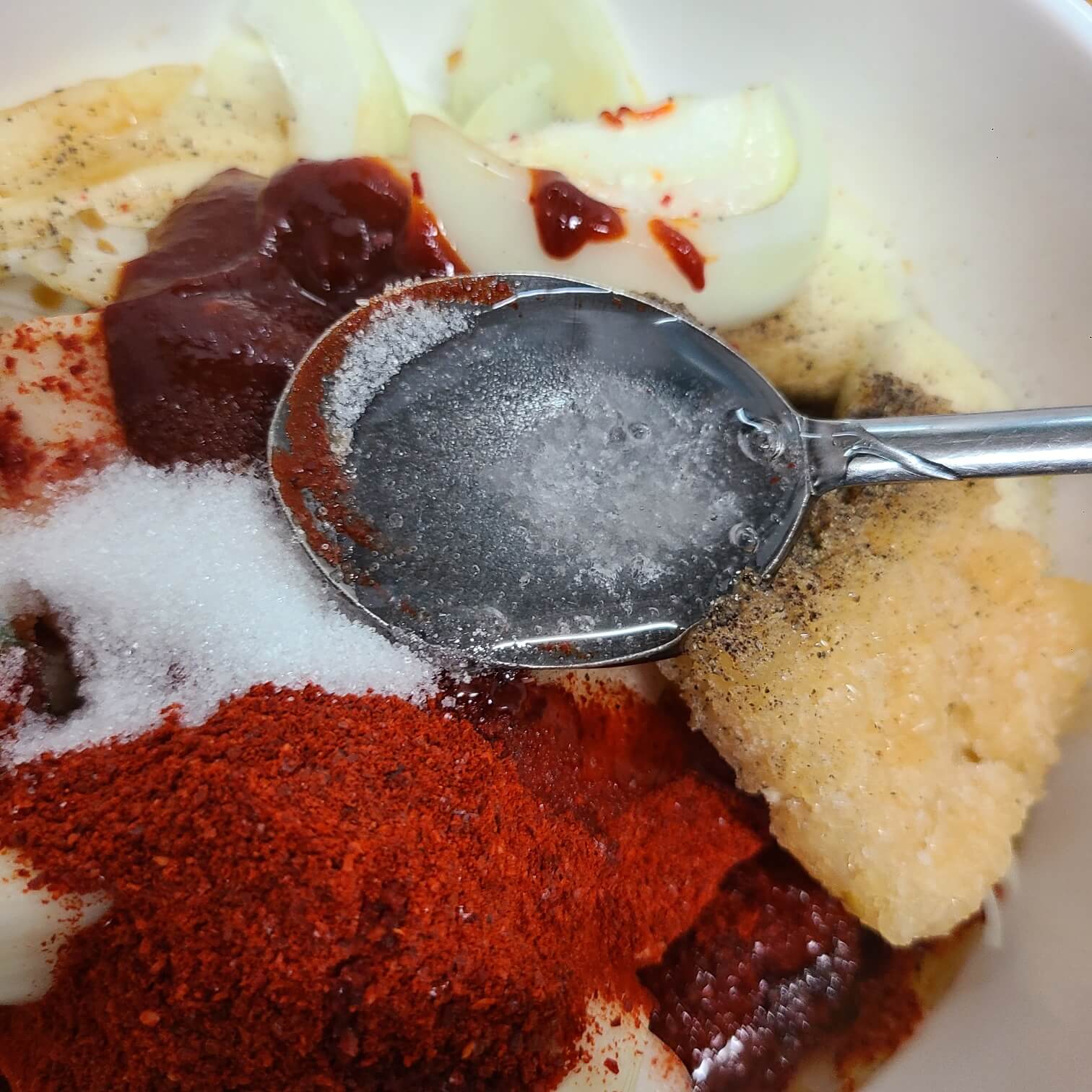 • 무 539g, 양파 318g, 다진 마늘 2 46g, 고춧가루 3, 고추장 1, 맛술 1, 들기름 2, 소준 3, 후추 0.5, 설탕 1, 물엿 2, 간장 8.5 (60ml)