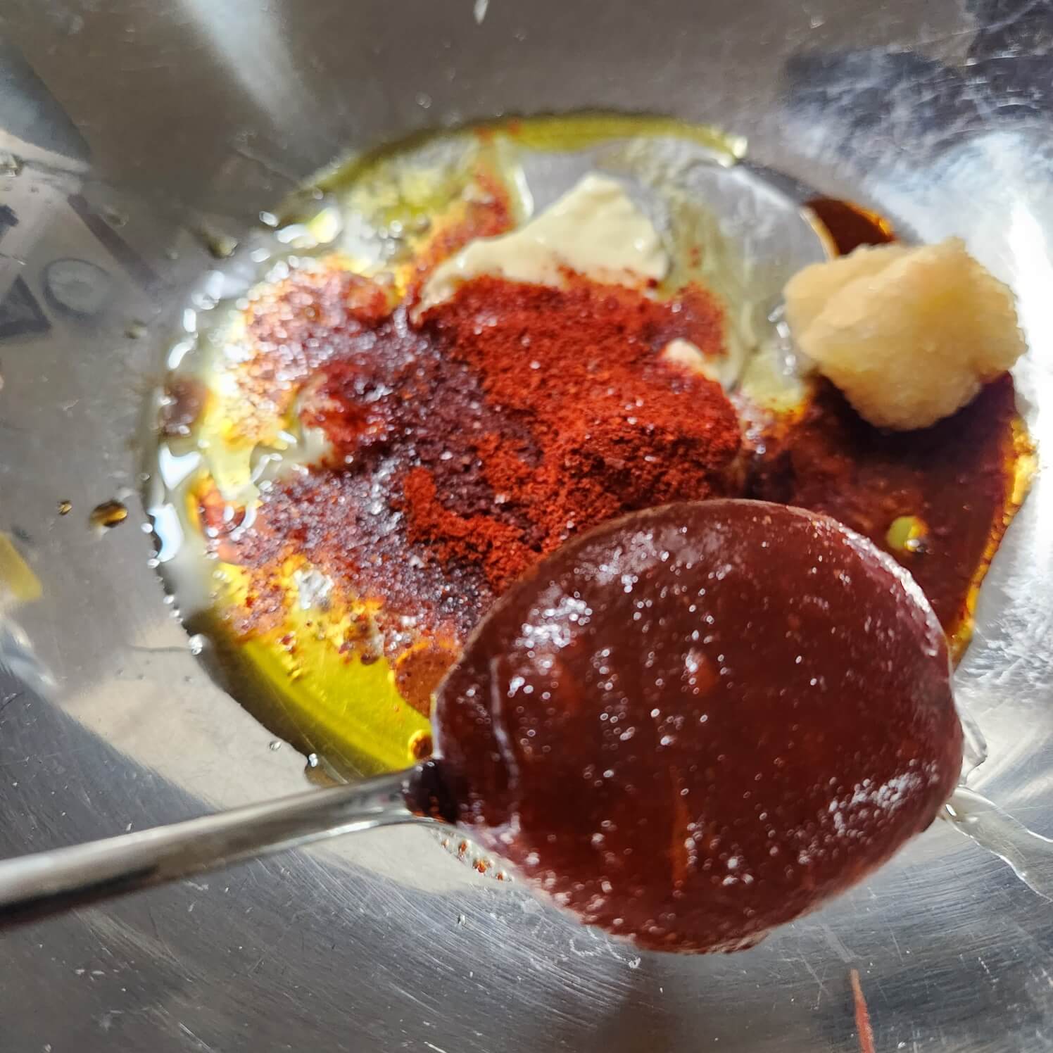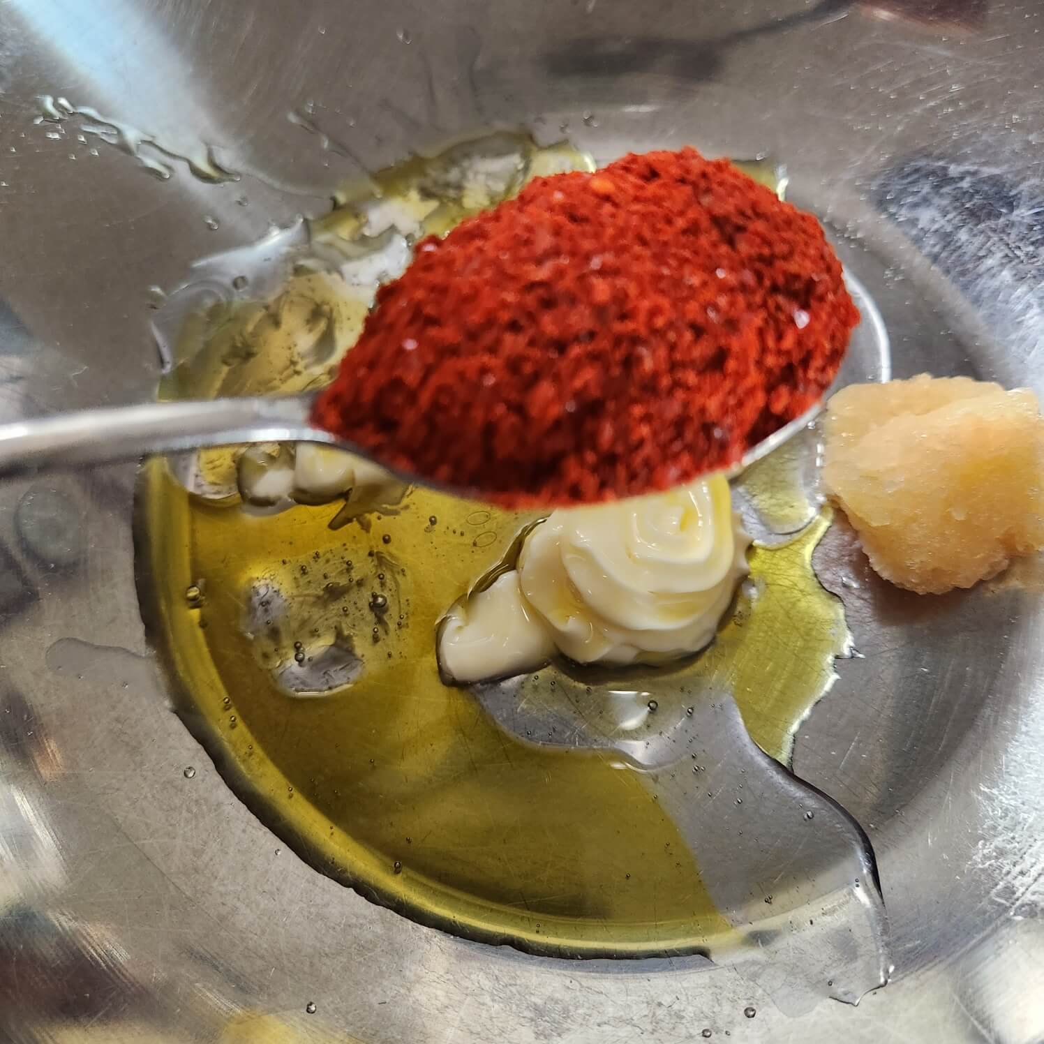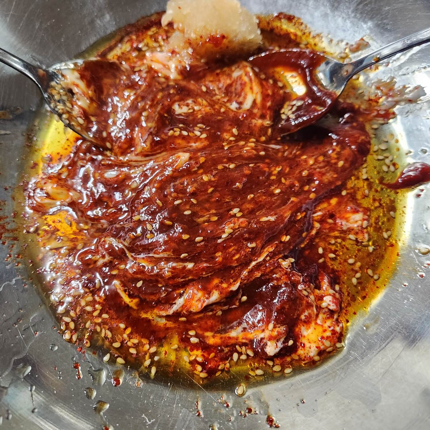 숟가락 기준 다진 마늘 1, 마요네즈 3, 물엿 3, 들기름 4, 고춧가루 2, 간장 1.5, 참기름 1, 통깨 1, 고추장 1.5를 넣고 잘 섞어주면 완성이다.