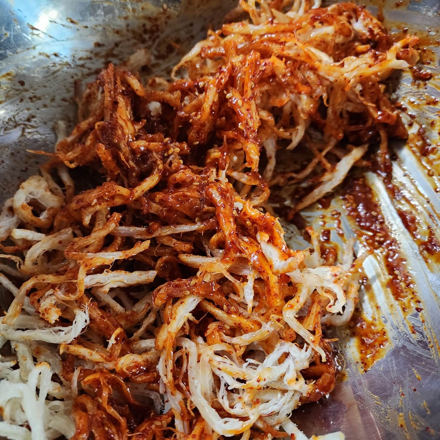 👉중간에 버무리면서 주먹 쥐듯이 "진미채"를 잡고 꾹꾹 누르면 간이 더 잘 베니 참고하면 좋다.