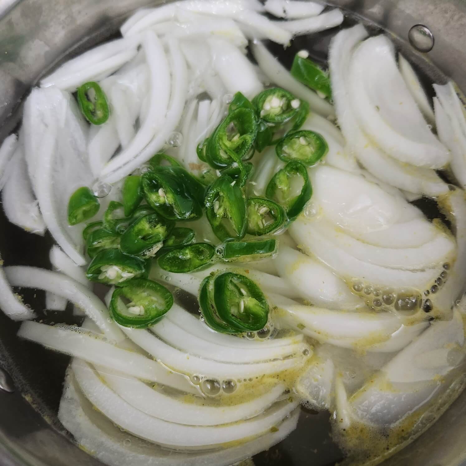 - 치킨스톡, 양파 1개, 계란 3개, 소금, 후추, 홍게액젓, 청양고추 1개, 다진 마늘, 물 1L