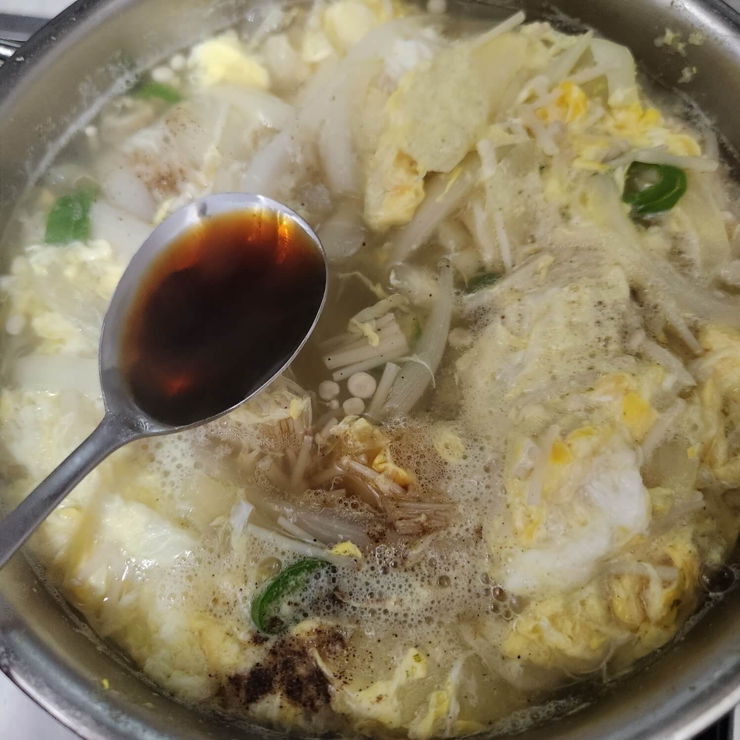 5. 계란 넣고 육수가 끓기 시작하면 티스푼으로 소금 2, 후추 1 넣고, 밥 숟가락으로 홍게액젓 2번 넣어주면 완성입니다.