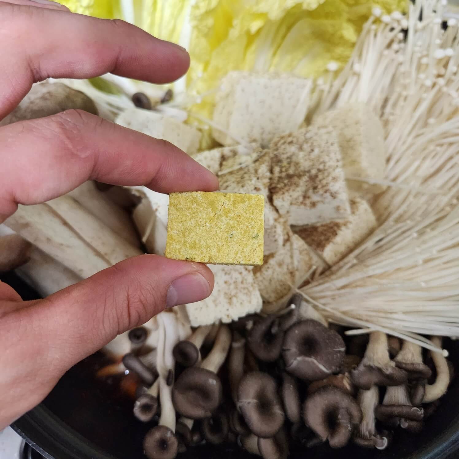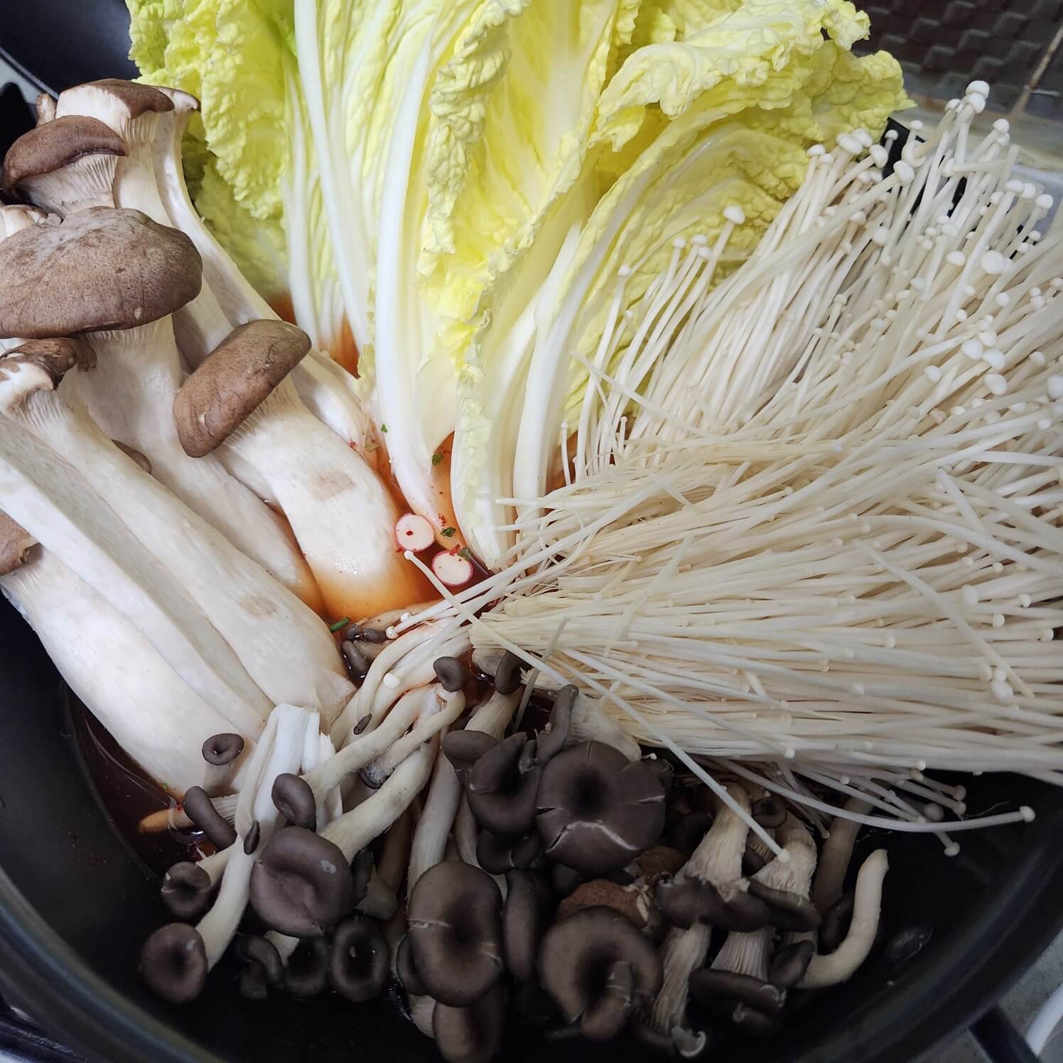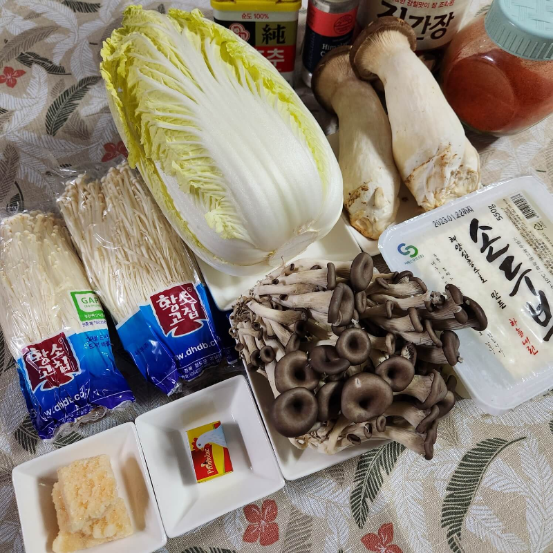 - 배추 반포기, 팽이버섯 2팩, 느타리버섯 1팩, 물 1L, 마늘, 치킨스톡 1, 새송이버섯 3개, 두부 한모, 국수장국