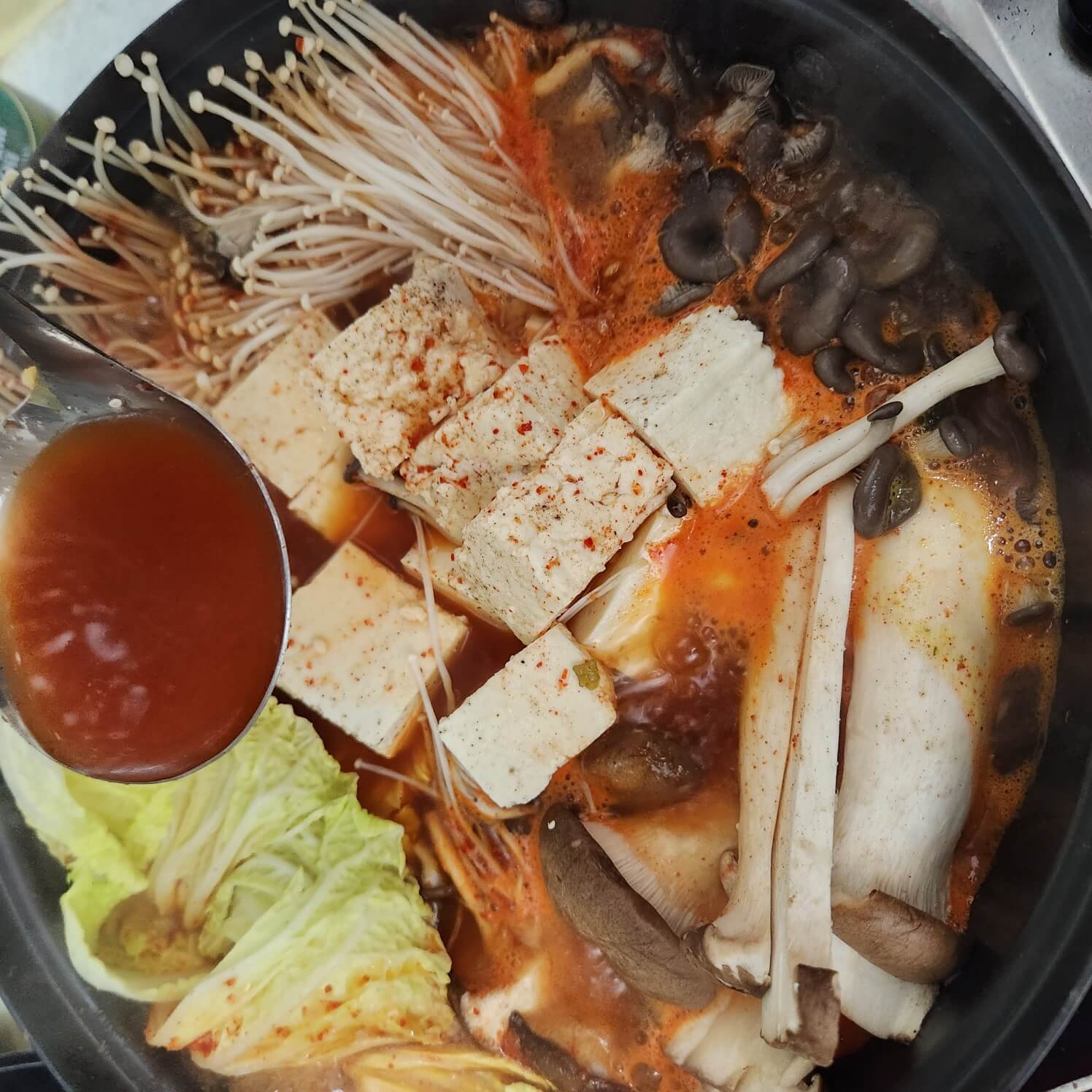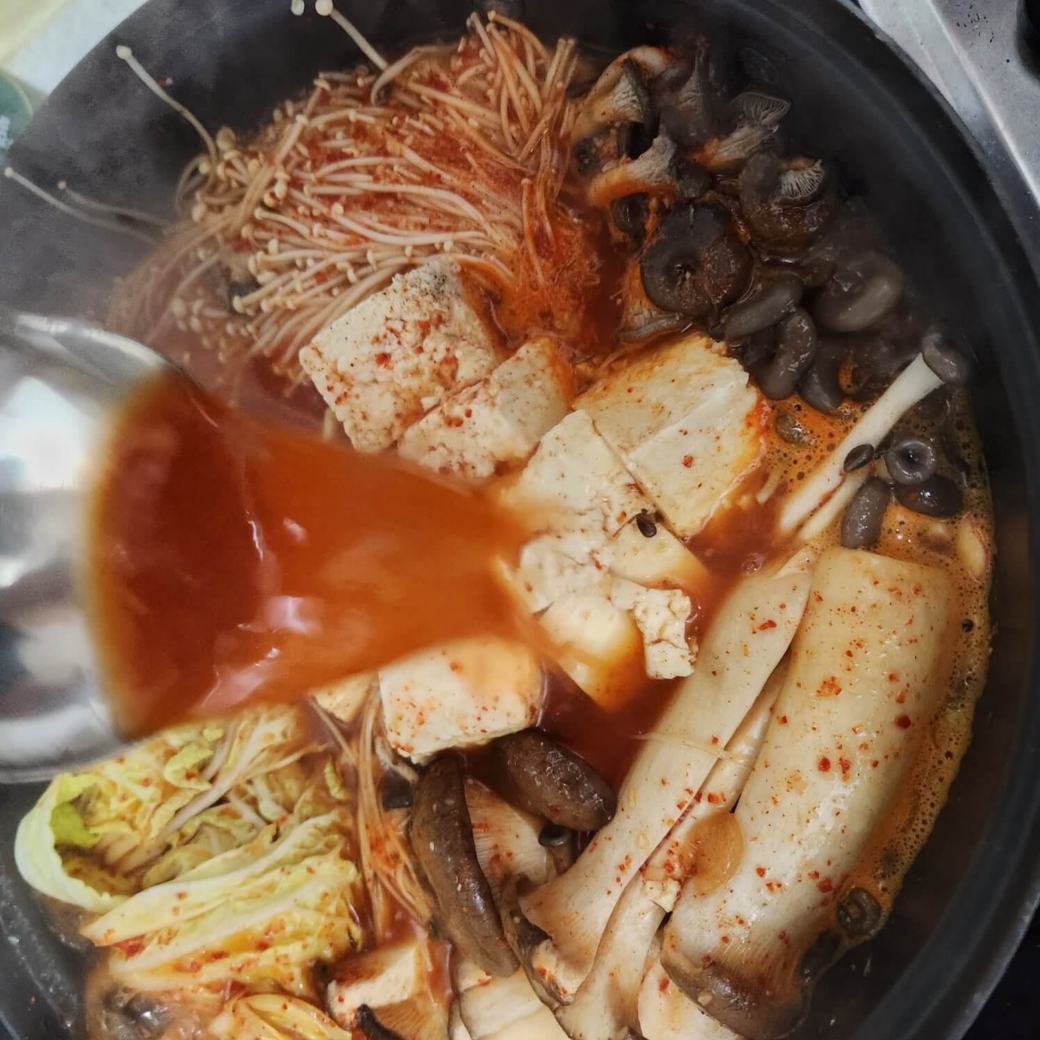 👉끓는 육수를 야채, 두부 위에 부어서 간이 잘 베개 국자로 떠서 부어주면 돼요.